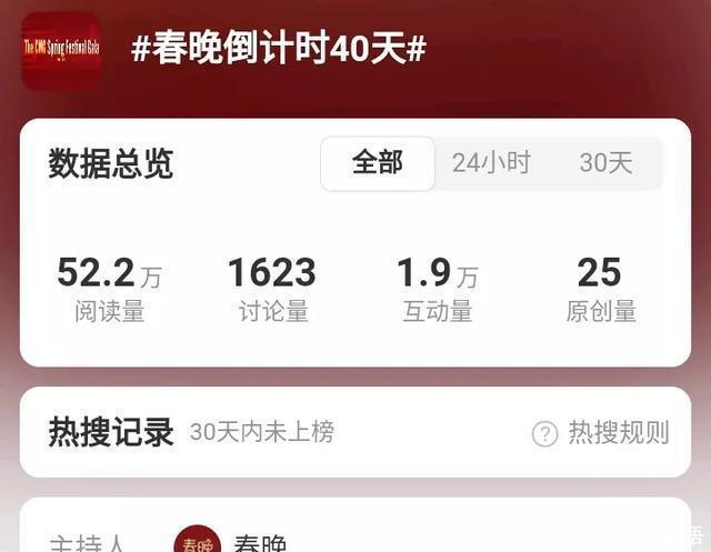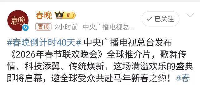 春晚倒计时40天,传来一个好消息!原来,《2026年春节联欢晚会》全球推介片发布。由此带来世界各地观众的关注度!对此,网友们纷纷热议“春晚倒计时40天”话题消息!这一话题阅读量达到52.2万,互动量有1.9万。