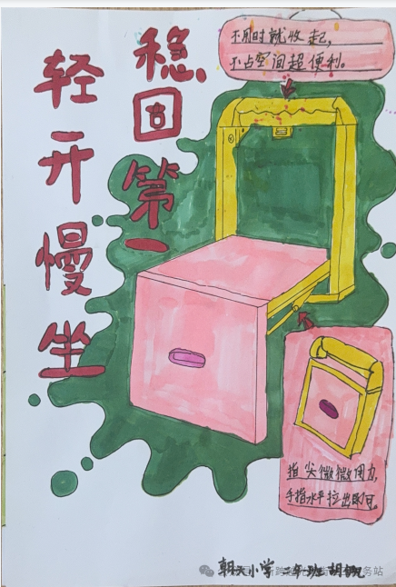 此外,小学生们还化身“小小设计师”,在美术老师指导下创作了12套朗朗上口、兼具童趣与实用性的安全提示贴纸。折叠凳安装后,学生志愿者张贴安全提示贴纸,为路过的居民演示正确使用方法,并将使用视频发布在楼宇居民群内。从倾听诉求、协调资源到监督落实,学生们全程参与了一桩民生实事的诞生,对“全过程人民民主”有了更深刻直观的认识。