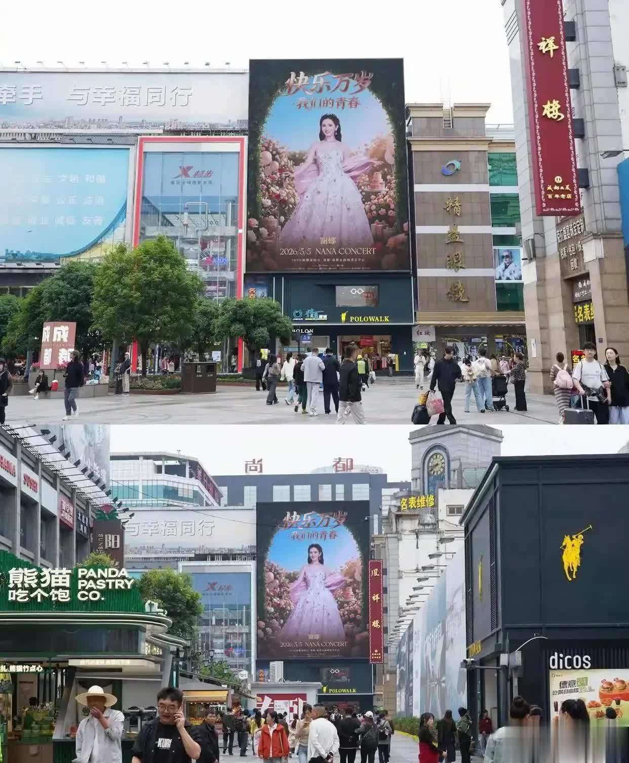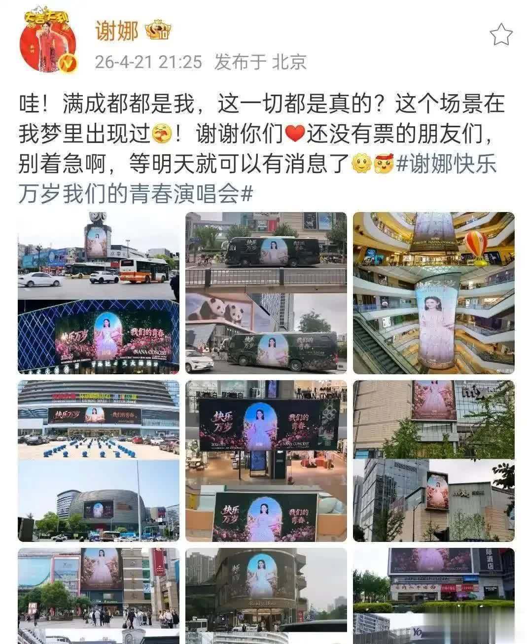 当成都的春熙路地标大屏、商场环形巨幕、公交车身乃至地铁灯箱,都被同一张笑脸占据时,这座城市仿佛在一夜之间被重新定义。这不是某个国际巨星的全球巡演,而是主持人谢娜个人演唱会的粉丝应援现场。4月21日晚,谢娜在社交媒体上晒出九张照片,配文“满成都都是我”,并感慨“这样的场景只在我梦里出现过”。